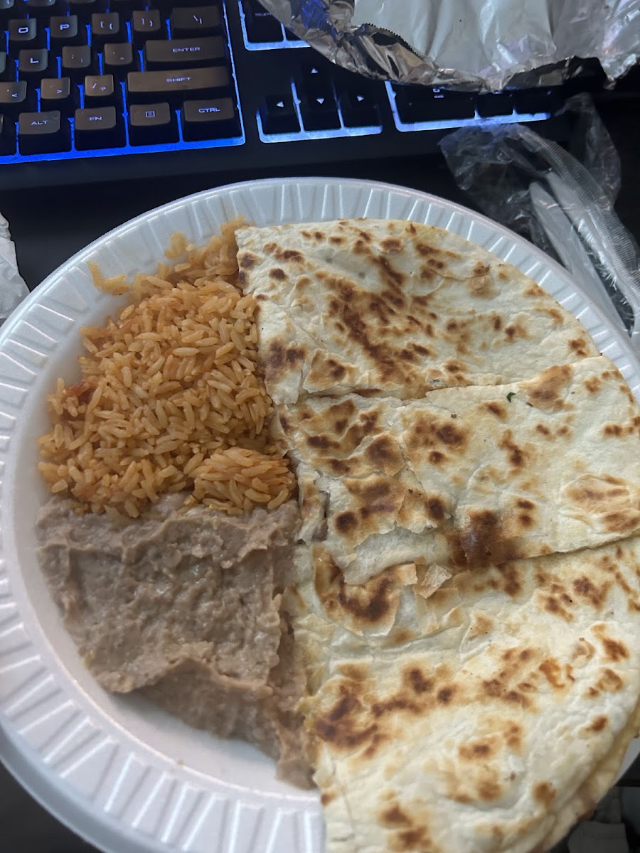 Rice and beans were very very well done. Shredded chicken tasted good but could have been more tender.